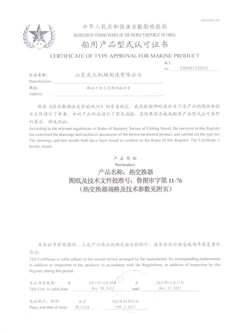 热交换器-船用产品型式认可证书