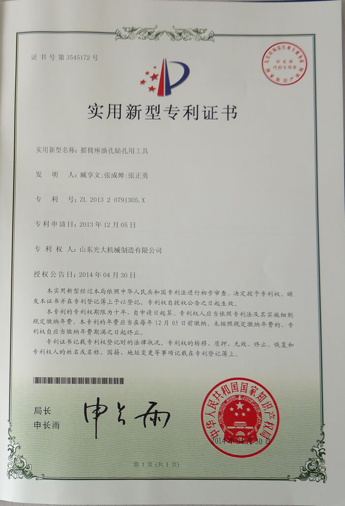 摇臂座油孔钻孔用工具-实用新型专利证书