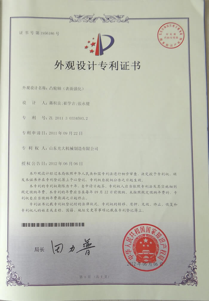 凸轮轴(表面强化)-外观设计专利证书