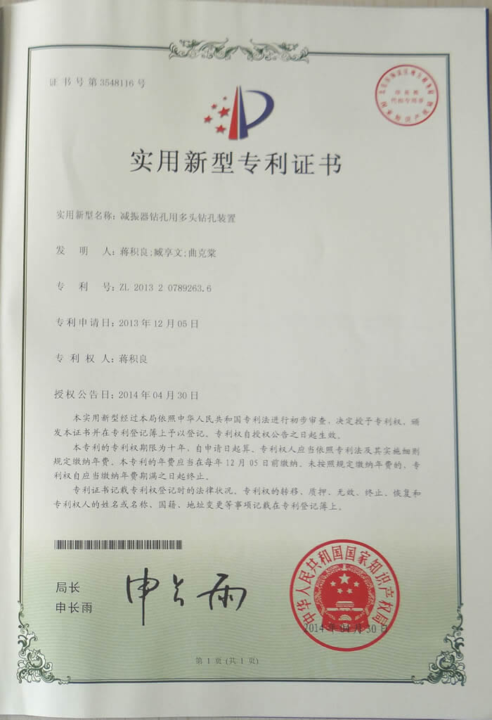 减震器钻孔用多头钻孔装置-实用新型专利证书