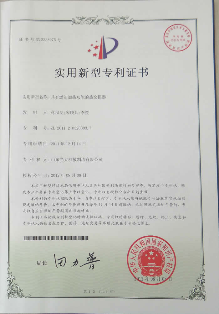 具有燃油加热功能的热交换器-实用新型专利证书